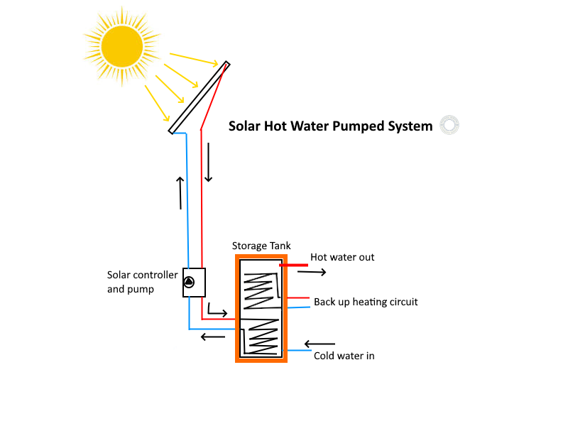 A thermo-siphon system is where the storage tank is connected above the panels. As the panels heat up, the fluid natrually rises up through the tank where it disperses the heat and returns to the panel. No pump is required and these systems only can be backed up by an electric element.